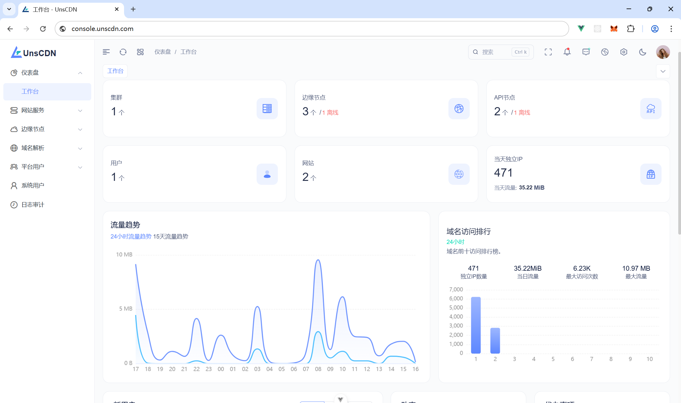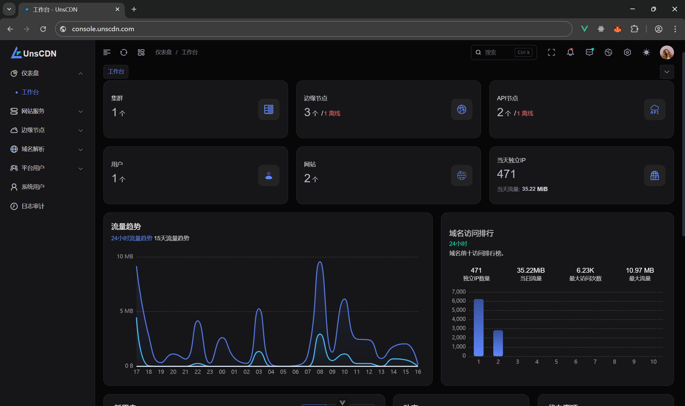 - 7×24 流量与安全事件可视化,支持阈值报警与异常突增提醒,辅助快速排障与运营决策。
